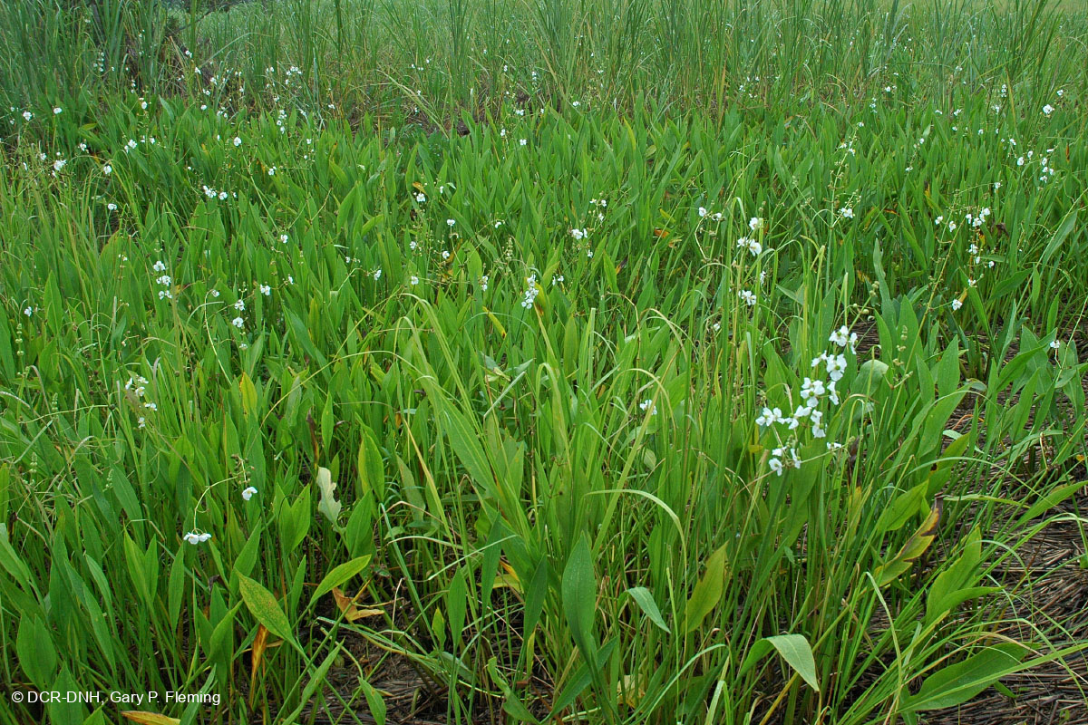 رأس سهم لسان الثور(Sagittaria lancifolia var. الوسائط) هو أحد أنواع المستنقعات قليلة القلة، خاصةً في المجتمعات الأكثر اختلاطاً والأقل مكانة. على طول رافد صغير لنهر جيمس في جزيرة جيمستاون، مقاطعة جيمس سيتي. الحديقة التاريخية الوطنية الاستعمارية. © DCR-DNH، غاري ب. فليمنج