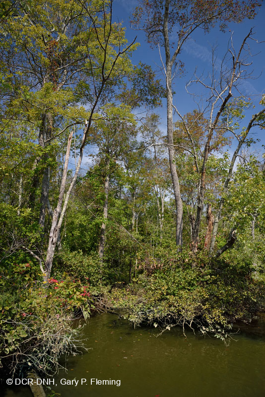 مستنقع نموذجي إلى حد ما من الأخشاب الصلبة المدية مع مستنقع التوبيلو(نيسا بيفلورا) ورماد اليقطين(فراكسينوس بروفوندا) فوق طبقة شجيرات كثيفة ومتنوعة. على طول الامتداد السفلي لخور سويفت كريك، بالقرب من نقطة التقاءه مع نهر أبوماتوكس، مقاطعة تشيسترفيلد. © DCR-DNH، غاري ب. فليمنج