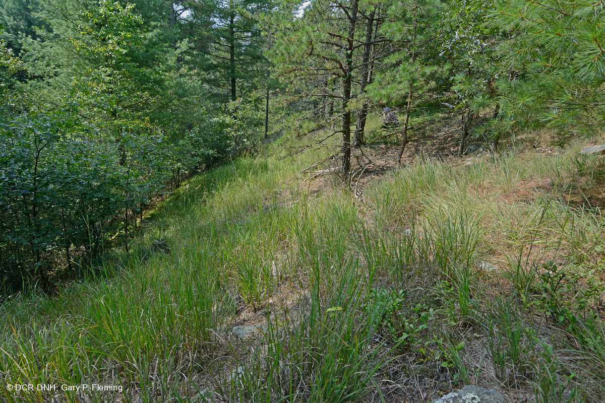 واحدة من المدرجات القليلة المتبقية من غابات جنوب بلو ريدج فائقة الدقة، والتي تتميز بأعشاب الموسم الدافئ تحت منصة مفتوحة من الصنوبر (Pinus rigida) والصنوبر الأبيض(Pinus strobus)والبلوط (Quercus stellata). على منحدر يواجه الجنوب الغربي يقع تحت صخرة شيست التلك والتريموليت وتحت خور تشيستنت في منطقة جليدس في جنوب شرق مقاطعة Grayson. © DCR-DNH، غاري ب. فليمنج