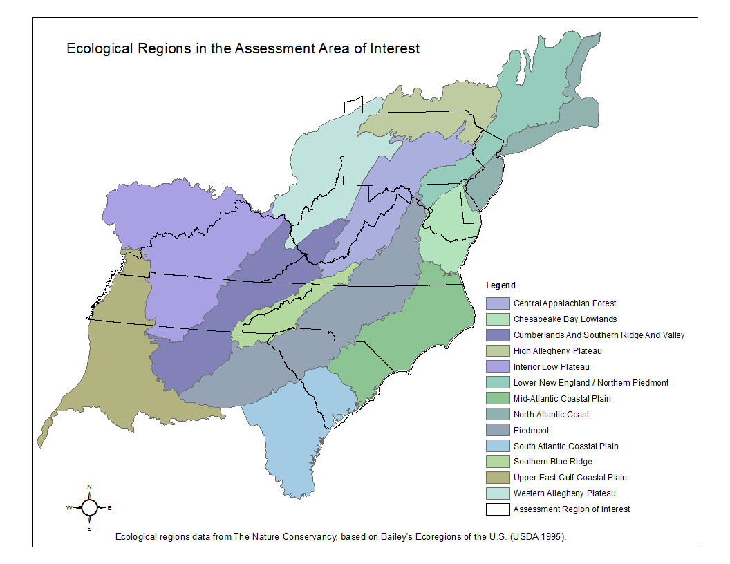 تم تعريف المنطقة محل الاهتمام في هذا التقييم على أنها ولايات نيوجيرسي وديلاوير وماريلاند ومقاطعة كولومبيا وبنسلفانيا وفرجينيا الغربية وكنتاكي وفرجينيا وفرجينيا وكارولينا الشمالية وكارولينا الجنوبية وتينيسي.