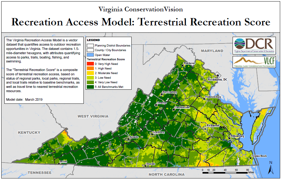 نموذج الوصول إلى الاستجمام في فيرجينيا هو عبارة عن مجموعة بيانات متجهة تقيس إمكانية الوصول إلى فرص الاستجمام في الهواء الطلق في فيرجينيا. تحتوي مجموعة البيانات على 1.5ميل سداسي القطر، مع سمات تحدد الوصول إلى المتنزهات والمسارات وركوب القوارب وصيد الأسماك والسباحة. يُستخدم المصطلح "الحديقة" بشكل فضفاض للإشارة إلى أي كتلة متجاورة من الأراضي ذات إمكانية الوصول العام للاستجمام. "السباحة" تشير السباحة إلى فرص السباحة خارج المسبح أو الشاطئ أو الضفة.