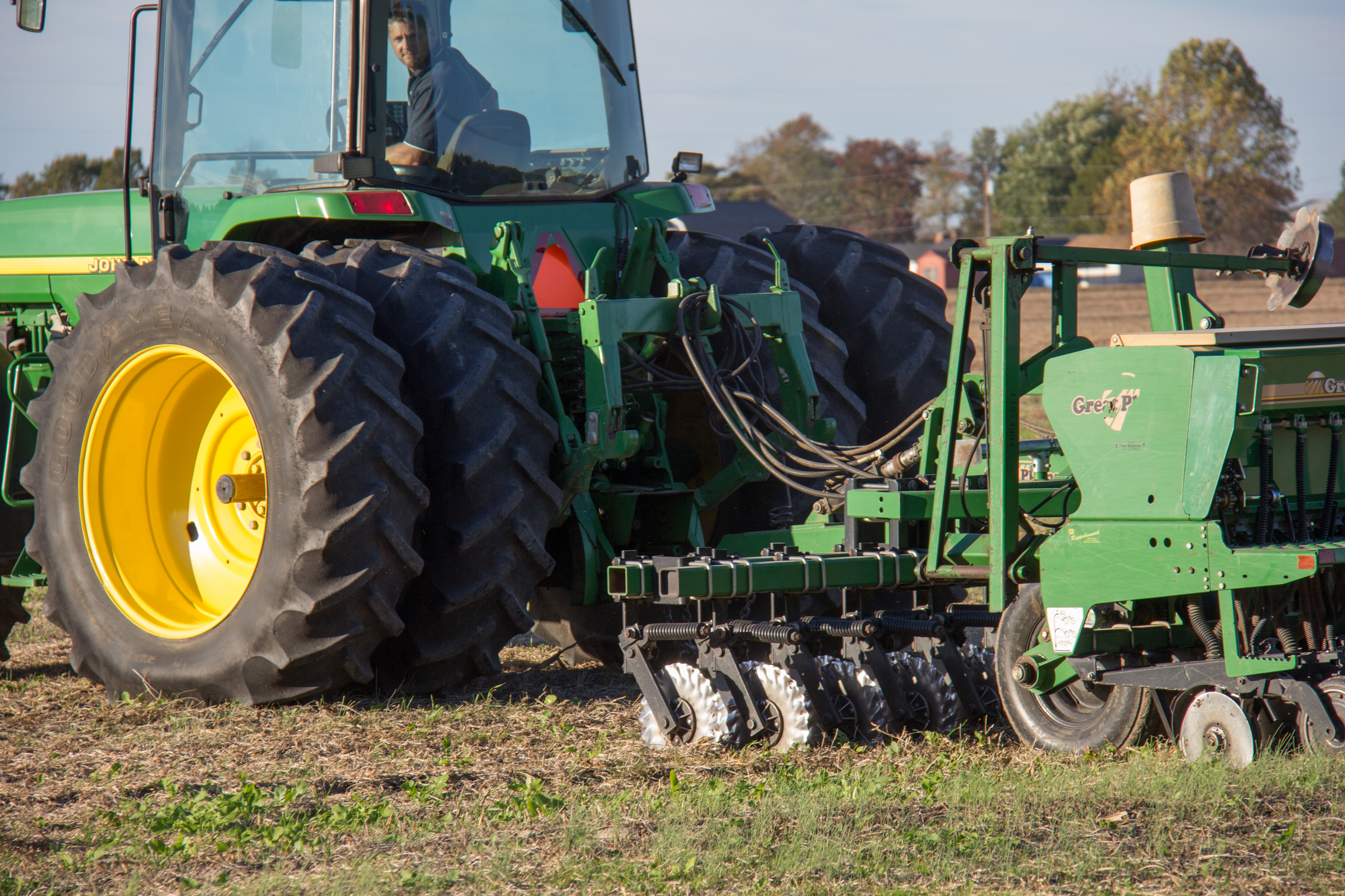 (المحررون: اتبع هذا الرابط لتحميل صورة. تعليق على الصورة: مزارع يزرع المحاصيل باستخدام حفار بدون حراثة. الزراعة بدون حراثة هي واحدة من الممارسات العديدة التي يمكن للمنتجين الحصول على تمويل لتقاسم التكاليف من أجلها. (الصورة مقدمة من إدارة الحفظ والاستجمام في فيرجينيا).