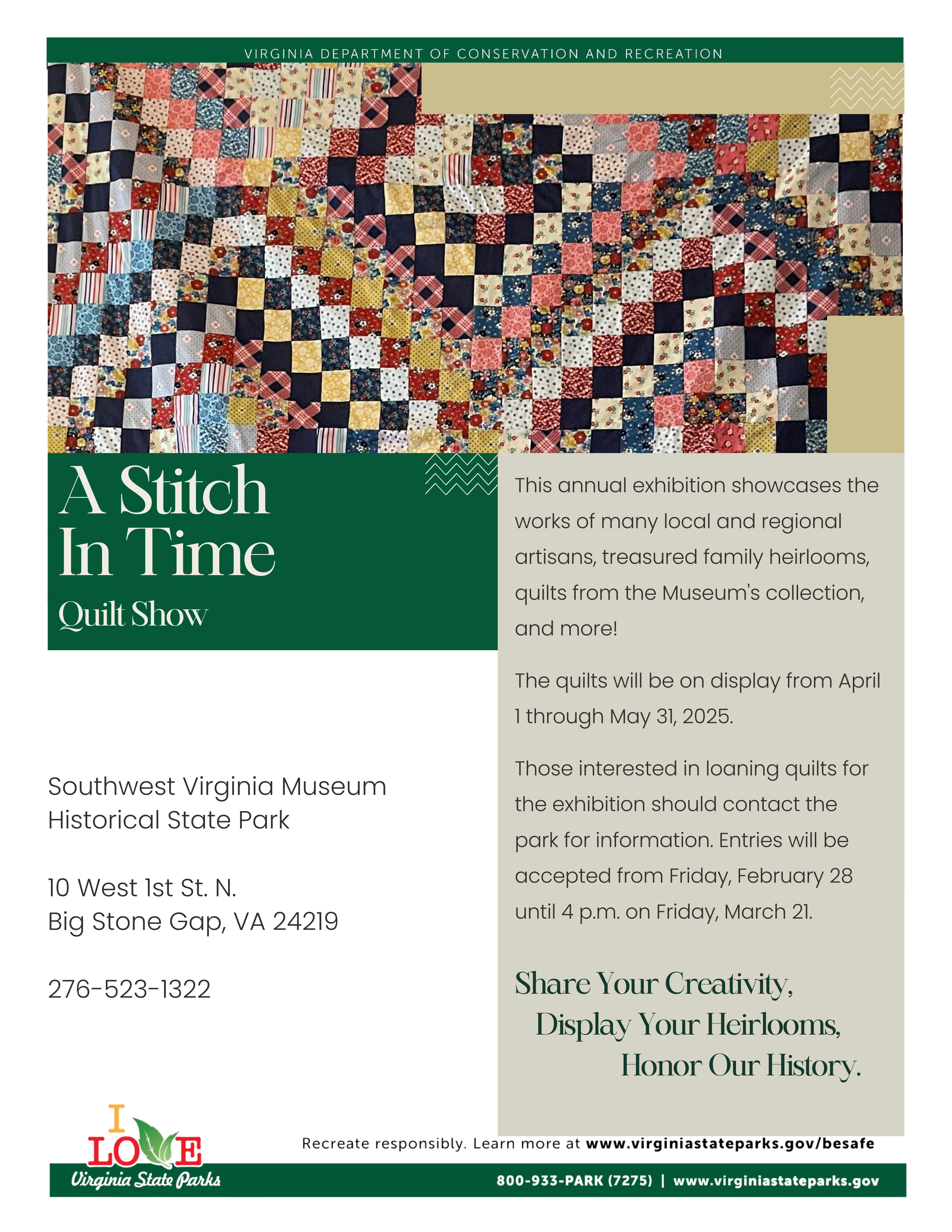يقبل متحف جنوب غرب فرجينيا التاريخي والمنتزه الحكومي الآن المشاركات في معرض "Stitch in Time" للبطانيات المطرزة. في موسمها الخامس عشر بعنوان " 28"، تكرم هذه المعرض السنوي صانعي الألحفة في الماضي والحاضر، وتعرض ألحفة ليس فقط من مجموعة المتحف، بل وأيضًا من أعضاء المجتمع الذين يعرضون ألحفة من مجموعاتهم الخاصة.