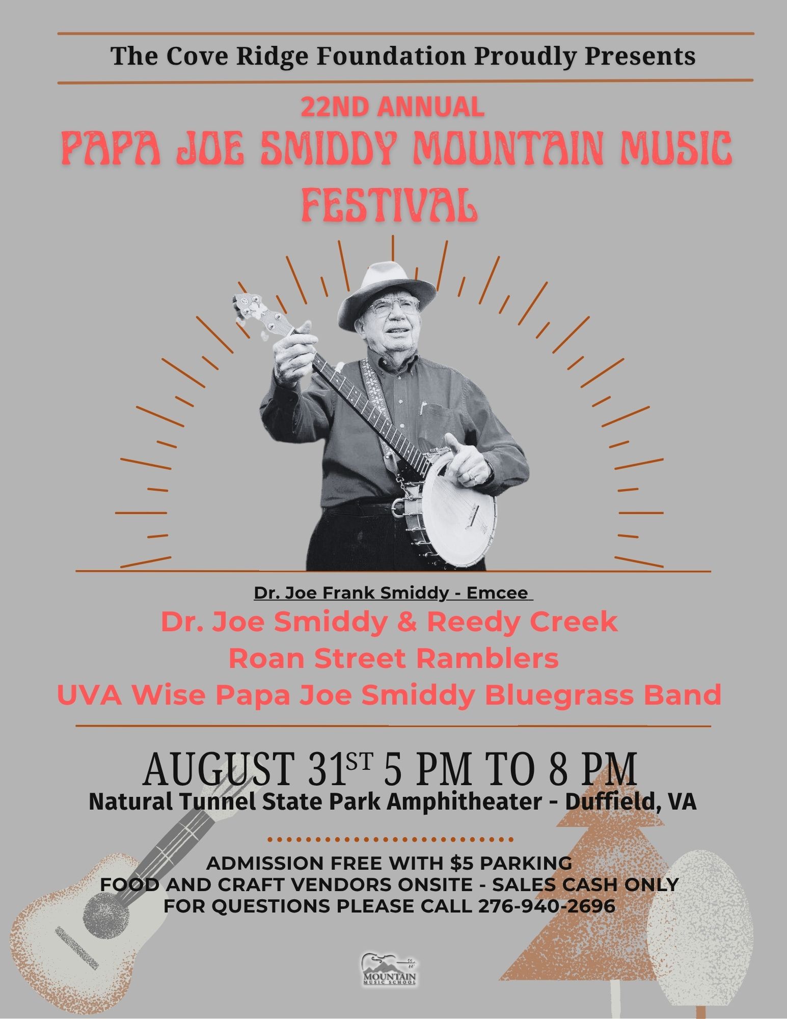 مهرجان بابا جو سميدي للموسيقى الجبلية هو احتفال بموسيقى الآبالاش. لموسيقى الزمن القديم وموسيقى البلوجراس تاريخ طويل في جبال أبالاشيا، وتريد مؤسسة كوف ريدج الحفاظ على هذه التقاليد وغرس الشغف بها في شبابنا. سُمي المهرجان باسم المستشار الفخري لجامعة فرجينيا في وايز الدكتور جوزيف س. "بابا جو" سميدي، وهو معلم وفنان وموسيقي معروف وموسيقي مشهور في الزمن القديم.